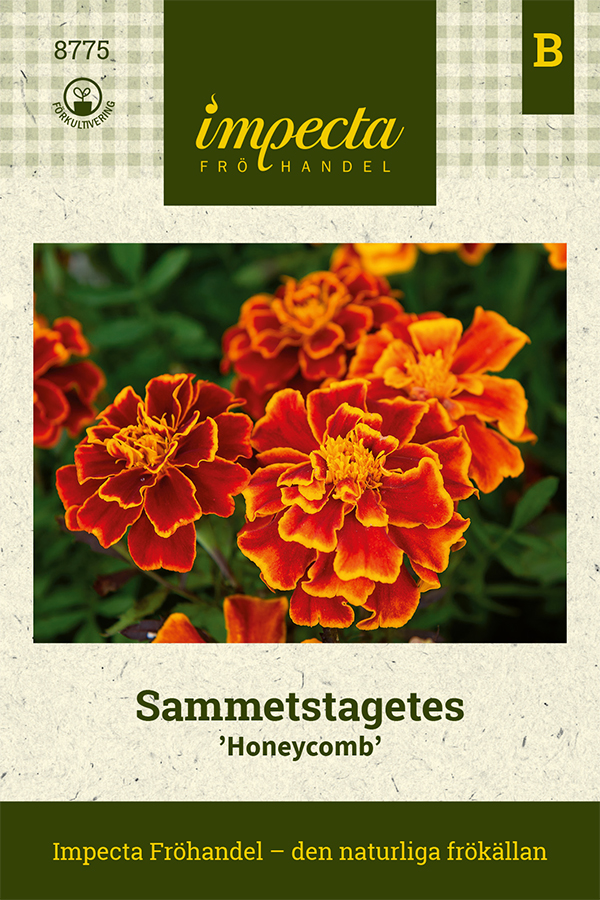 Dubbla, tegelröda blommor, vackert tecknade med guldgul krona och kronbladskanter. Utmärkt för krukor, lådor och rabattkanter.