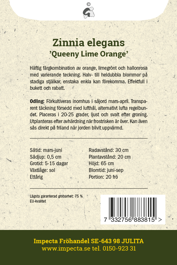 Häftig färgkombination av orange, limegrönt och hallonrosa med varierande teckning. Halv- till heldubbla blommor på stadiga stjälkar, enstaka enkla kan förekomma. Effektfull i bukett och rabatt.