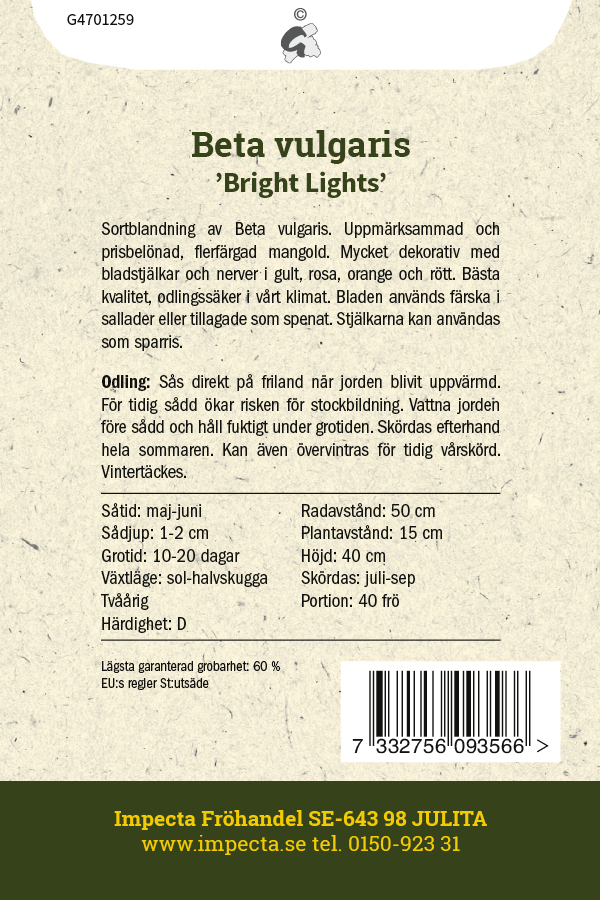 Uppmärksammad och prisbelönad, flerfärgad mangold. Mycket dekorativ med bladstjälkar och nerver i gult, rosa, orange och rött. Bästa kvalitet, odlingssäker i vårt klimat. Bladen används färska i sallader eller tillagade som spenat. Stjälkarna kan användas som sparris.
