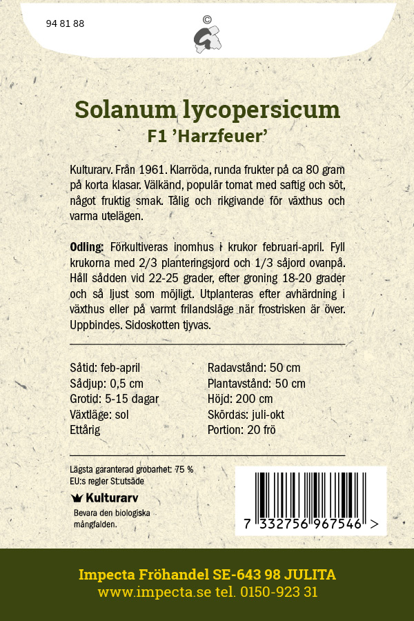 Förkultiveras inomhus i krukor feb-april. Fyll krukorna med 2/3 planteringsjord och 1/3 såjord ovanpå. Håll sådden vid 22-25 gr, efter groning 18-20 gr och så ljust som möjligt. Utplanteras efter avhärdning i växthus eller på varmt frilandsläge när frostrisken är över. Uppbindes. Sidoskotten tjyvas.