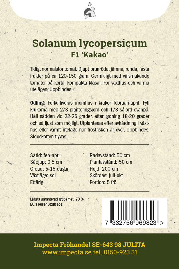 Förkultiveras inomhus i krukor feb-april. Fyll krukorna med 2/3 planteringsjord och 1/3 såjord ovanpå. Håll sådden vid 22-25 grader, efter groning 18-20 grader och så ljust som möjligt. Utplanteras efter avhärdning i växthus eller varmt uteläge när frostrisken är över. Uppbindes. Sidoskotten tjyvas.