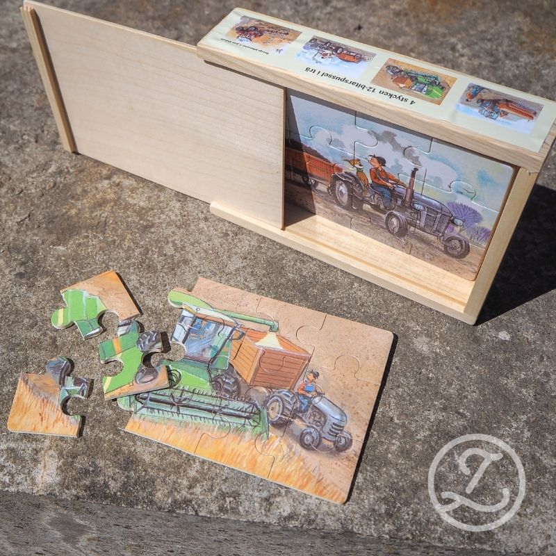 Upptäck Mulle Mecks fascinerande värld med detta träpussel. Setet innehåller fyra träpussel, var och ett bestående av 12 bitar, och ger en spännande inblick i jordbruksmaskinernas värld. Pusslen har fina illustrationer av välkända maskiner som plog, gödselspridare, skördetröska och såmaskin.