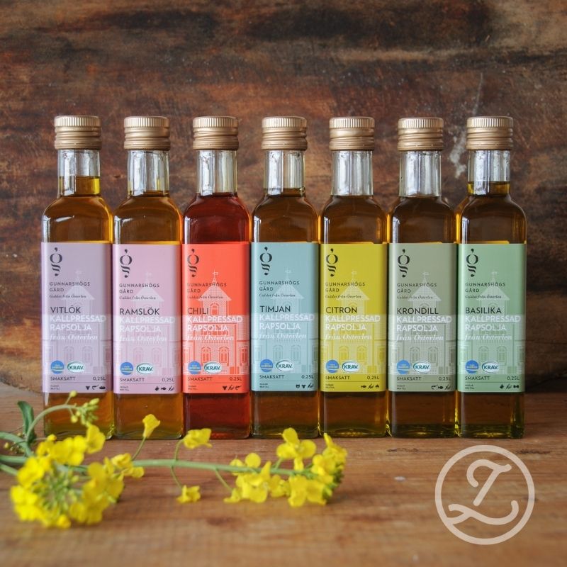 Gunnarshögs smaksatta rapsoljor är naturligt smaksatta med naturliga aromer från chili, citron, timjan, vitlök, basilika, krondill och ramslök. Passar allt från vinägretten till den mustiga soppan, och lämpar sig till både kall och varm matlagning. Kravmärkta och producerade på Gunnarshög gård på Österlen.